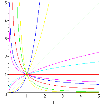 Obrázek ukazuje funkce x^c pro různé hodnoty parametru c. Pro c=0 dostaneme známou konstantu,